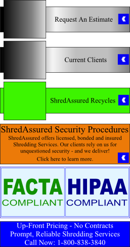 Please click here for more information, or give us a call at 1-800-838-3840 to find out how ShredAssured can help you save money, protect your information, and comply with federal and state laws. Our client specialists are ready to assist and willing to help in any way they can.